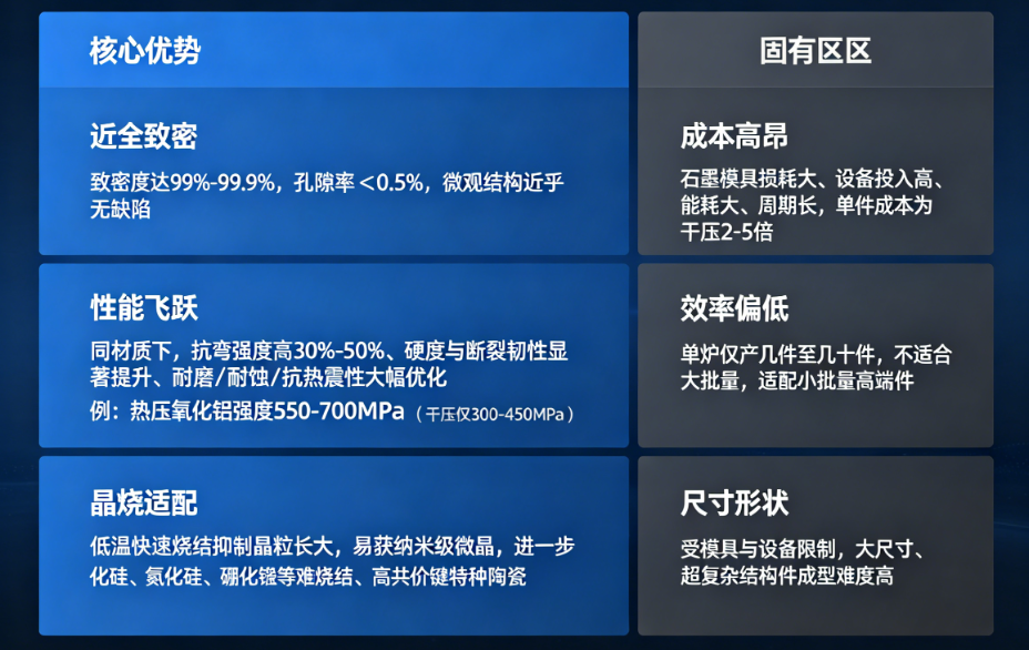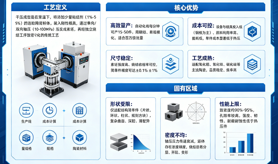 一、两大工艺原理与核心特性全解析1. 干压成型:高效量产的标准化选择![]() 2. 热压成型工艺定义热压是成型与烧结一体化的先进工艺:在真空 / 保护气氛中,将粉体装入耐高温模具(石墨为主),同步施加高温(1400-2200℃)+ 高压(20-40MPa),粉体在热塑流动中快速致密化,一步成型近全致密陶瓷。 ![]() 二、干压 vs 热压:核心维度对比表