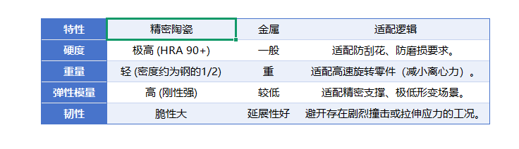 在半导体制造与高端工业领域,精密陶瓷常被冠以“全能材料”的光环。从刻蚀腔体的耐磨部件到光模块的散热基板,其耐高温、耐腐蚀、高硬度的特性似乎让它无所不能。 然而,在精密陶瓷领域深耕多年的行业人士深知:工业界没有真正意义上的“全能材料”,只有“适配”的工况选择。 01 认知误区:为什么有些陶瓷件连 1000 次撞击都撑不住?很多设备工程师和采购在初次接触陶瓷材料时,往往被其出色的硬度数据所吸引,但在实际装机后却遇到了“易碎”的尴尬。 这并非材料本身的质量缺陷,往往是因为误用了不适配的工况。精密陶瓷虽然硬度极高,但其脆性大、断裂韧性低是天然的短板。 第一,应果断避开剧烈垂直冲击的工况。 在高频冲压、重锤敲击或带有剧烈振动的金属破碎环境中,陶瓷材料的物理特性决定了它无法像金属那样通过塑性变形来吸收能量。即便表面硬度再高,其内部也会在微秒间产生微裂纹,从而影响整体的使用寿命与安全性。 第二,需摒弃“粗放式”的紧固连接方式。 陶瓷具有“宁折不弯”的个性,完全不具备金属的延展性。如果在安装时试图用金属螺丝直接大扭矩硬拧陶瓷孔,或者进行无缓冲的过盈压装,受力不均产生的应力集中会令陶瓷件瞬间炸裂。 因此,在工业应用中,理解材料的“个性”比盲目推崇其指标更为重要。 02 主场优势:这三大领域,精密陶瓷是行业霸主虽然精密陶瓷怕“硬碰硬”,但在特定的极端工况下,它所展现出的可靠性是特种钢材也难以企及的。 其一:零污染的“纯净”摩擦场景。 在半导体晶圆传输、生物制药搅拌以及高端医疗器械中,洁净度就是生命线。 金属材料在往复运动中产生的金属离子磨屑,是导致芯片报废或药品污染的元凶。而精密陶瓷(如氧化铝、氧化硅)的磨损率极低,且其掉落的微粒具有化学惰性,不会与环境发生反应。对于追求高良品率的产线而言,这种“纯净”特性具备核心价值。 其二:强酸碱与高速冲刷的“双重炼狱”。 在化工强酸泵、石油钻探喷嘴、矿山泥浆阀等工况下,材料不仅要面对化学腐蚀,还要承受高压流体的物理冲刷。 特种金属往往会先被腐蚀层“软化”,随后被泥沙轻易冲走。精密陶瓷天生免疫绝大多数酸碱腐蚀,在保持结构完整性的同时,能实现超长工况待机,显著降低了企业的停机换件成本。 其三:高频位移中的“微米级”坚守。 在高速点胶机阀芯或精密测量滑块中,要求零件每分钟进行上千次往复摩擦,且尺寸偏差必须控制在微米(μm)级别。 金属零件运行数日后可能就会因磨损而产生尺寸漂移,但氧化锆等精密陶瓷材料硬度高、热膨胀系数小,能确保设备在长效运行中依然保持极高的一致性。 03 核心底座:氧化铝、氮化铝与氧化锆的差异化应用针对不同的半导体与工业场景,材料的选型至关重要。